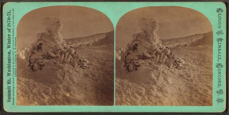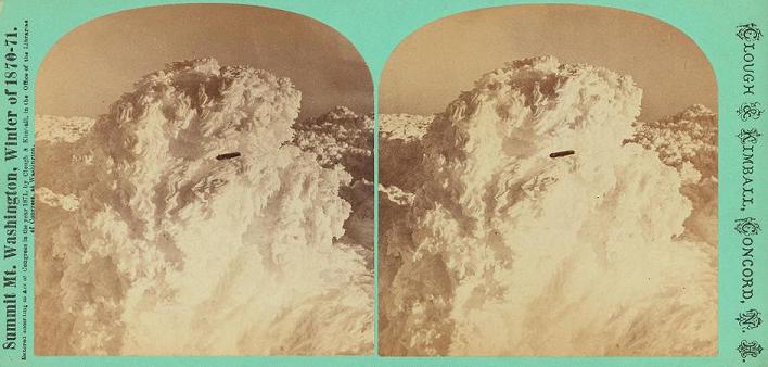 Figure 2 Fig.1 is particularly interesting. What could, at first glance, look like an enormous mountain covered in snow and topped with a majestic cloud, turns out to be altogether about waist-high, with a particularly novel ice formation on top, probably the size of a basketball. Likewise, in #9, the title indicates that the scene is frost patterns on a "chain" on the Tip-top house. It also seems to be a close-up photograph, taken to accentuate the small, frost details. There are others that have a similar, abstract quality, with ambiguous scale issues, such as #14, #17, and #18. Again, these look like possible grand vistas featuring huge formations of ice and/or ethereal clouds—just like the UFO photograph. However, these are all likely close-ups detailing the interesting frost patterns. Further, when distant landmarks like mountains or lakes, in this series of photographs are in view, they are noted and named (i.e., #4, #12, and #8.) Also, the depth of field is so shallow, that the distant landmarks are not in focus, or well-lit. If the UFO photograph were taken against an entire mountain peak, (large enough to dwarf an airship,) then, in accordance with the protocols seen in this series, it would likely be named to reflect the geography, as well as the other (what would have to be huge) mountains in the even-further background—and it is doubtful the depth of field would be wide enough to render such clarity; the scene is all consistent with small objects set fairly close to the camera. The title of the UFO photograph, Frost Formations, indicates that it is just that—patterns of snow and ice, instead of what has historically been said to be clouds surrounding a snowy mountaintop. This new title is important—because the title of the UFO photograph has previously been known as Summit Mt. Washington—furthering the idea that the photo is actually the summit of the mountain. It is now clear that the word "summit" refers to the setting of the whole series, as it is present on the left of each card. So, although it's quite illusory still, it seems this "mountain" in the iconic "first UFO photograph" is likely a small frosty lump, and the UFO/airship is probably just a very small piece of material (rock, ice, wood, etc.) left provocatively uncovered by the ice and snow. Photos: The Summit of Mount Washington during the Winter of 1870–71, stereoscopic view #17: "Frost Architecture" Wikipedia
