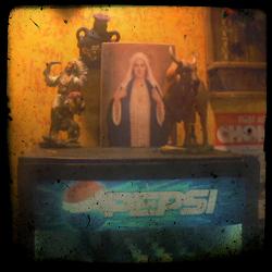 This is not Mexico, and this is not the fantastical, glorious Virgen de Guadalupe; here, the Holy Mother is unadorned, plain. There are no bright plastic flowers, nor are there colorful candles in jars, no milagros. Generally, there is no sense of "shrinage."